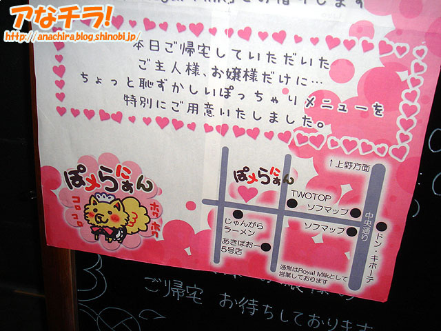 「世界初!ぽっちゃりしたメイドばっかりのメイド喫茶」をウリにしたメイド喫茶「ぽメらにあん」が10月6日(土)に1日限定で開店。場所はメイド喫茶「Royal Milk」の場所を借りており、時間は18時~22時の4時間のみ。メニューには「ちょっと恥ずかしいぽっちゃりメニュー」も用意されていた。 確認出来たぽっちゃり系メイドさんは20時頃旧日通ビル前でチラシを配っていたメイドさん1人で、ぽっちゃりレベルは女芸人「柳原可奈子ちゃん」レベル。その体型と同じ「はじけそうな」笑顔でチラシを配っている姿はかなり注目されており、メイドさんを見慣れているはずのアキバ人からでさえもすれ違った後に振り返って再確認されるほどだった。よほど強烈なインパクトを与えていたのだろう。 公式blogなどによると同店のメイドさんは合計6人らしいのだが、その他5人のぽっちゃりレベルは確認できていない。 店舗内を20時30分頃にこっそり覗いてみたところ客席はほぼ満席と賑わっていたのが確認できたほか、筆者が入り口で中の様子をうかがっている間にもチラシ片手に訪ねている人が数人見受けられた。 「巨乳系」や「ツンデレ系」などメジャーフェチ系に比べるとマイナーな「ぽっちゃり系」の要望がどれだけあるのかは不明。しかし、アダルトゲームやアダルトDVDにその手のコーナーがあり商品が用意されていることから、ある程度の固定ファンはいるものと想定される。今回の限定開店はその筋のファンにはたまらないイベントだったのではないだろうか。 良い意味でヤバイ成功をしたと思う「ぽっちゃり系メイド喫茶」に参加しそこねて残念だと思う人は、公式blogに再開店依頼をしてみてはいかがだろう。 ぽっちゃりメイド喫茶 ぽメらにあん |