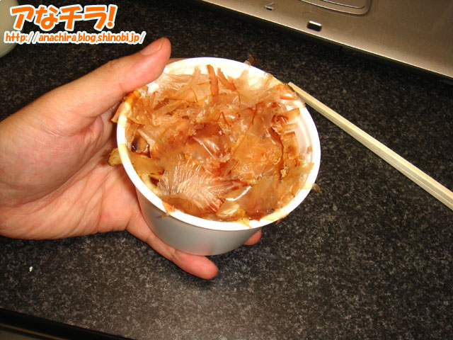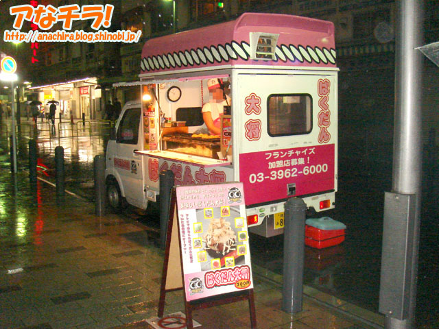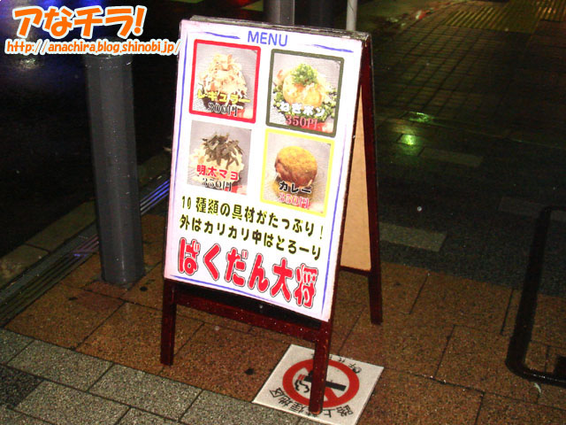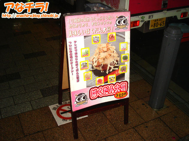 10種類の具材が入っているのがウリのオヤツ「ばくだん太郎」の販促用看板。JR秋葉原駅近くの路上で10月2日(月)に確認。 「ばくだん太郎」は、お好み焼きとたこ焼きが合わさったようなオヤツ。お好み焼きの様に豊富な具材が入っており、たこ焼きの様に外はカリカリ中はトロトロに焼き上がっている。種類は看板にあるレギュラー、ねぎポン、明太マヨ、カレーに加え、韓国風の5種類がある。 看板によると「レギュラー」は、具材が10種類(うずらの卵、ウィンナー、いか、おもち、しめじ、コーン、天カス、キャベツ、紅しょうが、青のり)で、ソース、マヨネーズ、かつお節がかけられている。大きさは直径約8cm程度。 早速買ってみたところ、見た目は「巨大なたこ焼き」で味は「お好み焼き」とそのまんまでした(笑)食い応えはありました。 どうでも良いことだが、看板に「ついにお台場にオープン」となっているのをみると、夏休みのシーズンなどにお台場で開店していた店舗だったのが、最近秋葉原周辺に観光客が集まっている状況をみて、営業場所を移してきたと推測される。これだけ見ると、秋葉原の観光地としての立場がお台場に近づいてきたようにも思える。 似たようなオヤツには池袋の「ばくだん焼」がある。 ばくだん焼池袋店 (k) PR