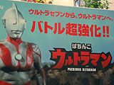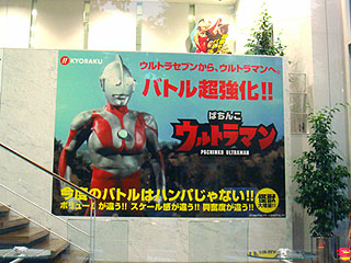 人気が高いパチンコ台「ぱちんこ ウルトラセブン」の後継機「ぱちんこ ウルトラセブン」を告知しているPOP。KYOURAKU東京支社内に飾られており、POPには「ウルトラセブンからウルトラマンへ」とも書かれている。 現在パチンコ業界ではウルトラセブンの台が人気が高い。これはパチンコのギャンブル性もさることながら、台に備えられた7インチ程度の液晶画面に慣れ親しんだウルトラセブンが登場して目を楽しませてくれるからだ。どうせ遊ぶなら知っているキャラクターが出る方が楽しいということらしい。そこでKYOURAKUでは次の慣れ親しみのあるキャラとして「ウルトラマン」に白羽の矢を立てたのだろう。 「ぱちんこ ウルトラマン」のウリは大当たりリーチ時の画面「バトルモード」に出場する怪獣数がウルトラセブンよりも多くなること。看板でも「ボリュームが違う!スケールが違う!興奮が違う!」としている。 前にも書いたがパチンコには良い思い出がない。それなのに良い思い出がいっぱいのウルトラシリーズが続々採用されているのは複雑な気分だ・・・ 享楽産業 □関連記事 (k)