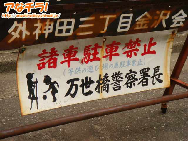 手まりや竹馬で遊んでいる子供のイラストが描いてあり、「子供の遊び場の為駐車禁止」という注意書きが書かれている。近くに昌平幼稚園/小学校があるので、その昔、この近くの道路で子供達が遊んでいたのだろう。万世橋系警察署長が子供の安全を守るために設置か寄贈したと思える。