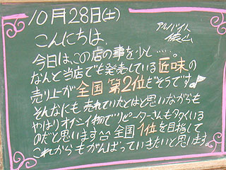 モスバーガー末広町店が「匠味」の売り上げ全国2位になったことを発表している看板。目標の全国1位まで後一歩のようです。 先日は5位にいることをお伝えしていましたが、着々と目標に向かって前進していますね。 □関連記事 (k)