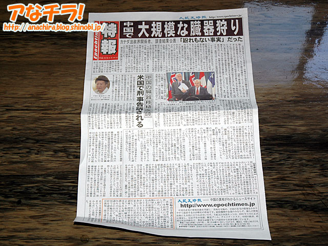 秋葉原で配られているものと言えば、電器店や萌え系店舗のチラシばかりだと思っている人が多いかもれない。もちろん、それは大方正しいが、たまに異色の配布物が登場することもある。それは例えば宗教や政治色の濃いものだ。今だと中央通りで「大紀元時報」という反中国共産党の色濃い新聞が配布中だ。 「中国共産党の情報封鎖を突破し、真相を見極め、中国の本当の情報をわかりやすく提供する」新聞だそうで、日本語版の新聞は月2回、中国語版は月4回発行されているという。記事は中国の共産党批判を中心に、中国国内で起こった事件や世界で報じられている中国関連のニュースをいろいろ掲載している。もちろんWebもあり、そこは日刊体制になっている。 現在、この新聞が力を入れているのが、中国で行われている臓器売買の問題で、秋葉原で配布しているスタッフも臓器摘出後の死体画像をプラカードに掲げて問題をアピール中。配布中の新聞も8面の通常発行分と臓器売買に関する2面の特報がセットになっている。 「ニューヨークに本部を置く報道社」だそうだが、日本支社の所在地はなぜか秋葉原1丁目。なんで秋葉原なの?と疑問が沸くところだが、秋葉原ではパソコン部品メーカーに勤める台湾の人がとても多いし、最近では中国からの観光客も急増しているので、反中国共産党を訴えるには絶好の場所という部分はあるのかもしれない。 ただでさえ政治に無関心でどちらか言えば毛嫌いする傾向にある日本人だが、こと秋葉原ではさらにその傾向が強い。客観的に見て、この新聞を配布しているゾーンだけ異端の雰囲気があり、少なくとも日本人はかなり避けて通っているのが実状だ。ま、いろいろとややこしいので、ここでは新聞の内容については論評せず、こんなもん配ってまっせ!という事実を書く程度にとどめておくことにする。 大紀元時報 (f) PR