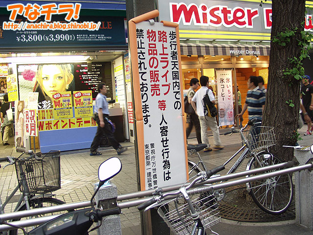 秋葉原の歩行者天国といえば、今やコスプレだのバンドだのパフォーマー達の百花繚乱状態ですが、たまに警官がそんな人達にダメだし(笑)しているときがあますね。もちろんコスプレやバンドの批評をやってるわけではなく、そういう行為自体が御法度なのよ!と注意して回ってるわけです。