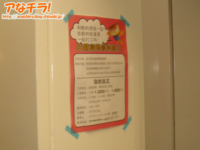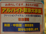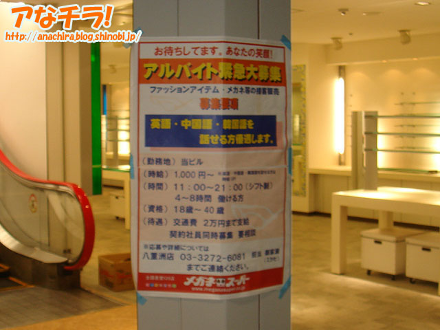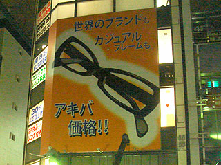 「アキバ価格!」をウリとしているメガネスーパーの看板。秋葉原では「パソコンや家電の価格が安い」というイメージはあるが、メガネの価格に関する価格情報は無いと記憶しているので何が言いたいのか不明。それとも「アキバ価格!=何でも安い」となっているのだろうか? ところでメガネスーパーが秋葉原の一等地に進出するに当たり疑問だったのが、眼鏡屋の需要が秋葉原にあるのかどうか。確かに秋葉原には眼鏡をかけた人は多いが、ほとんどの人は買い物客。彼らは地元で買うはずで、わざわざ秋葉原に来てまでというのは考えにくかった。 しかし、今回意外な所でターゲット層が判明。なんと日本人ではなく、観光で来ている外国人がターゲットらしいのだ。これは同店のアルバイト募集が「英語・中国語・韓国語を話せる方優遇」となってい点、中国語のみで書かれたアルバイト募集がある点から推測している。 とはいえ場所的に、地元の日本人に売れるのかさえ疑問なのに、さらに遠い外国から来ている人に売れるのかは不明。もしかしたら日本の眼鏡レンズ技術は評価が高く、外国人の方には人気があるのかもしれない。 ちなみに最近秋葉原の電気街口(万世橋方面)はホビー系ショップが増えているが、外国人観光客向けの店舗も増えている。今回の眼鏡屋も、秋葉原の外国人観光客マーケットが大きいこと証明する一例といえる。 メガネスーパー (k)