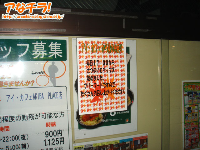 「さつまいもチップス」をフリーフードとしてサービスする告知POP。掲示しているのはアイカフェ秋葉原店。 夕方17:00から提供らしいけど、ココ競争率高いからフリーフード無くなるの早いんだよね。 インターネットカフェ アイ・カフェ (k) PR