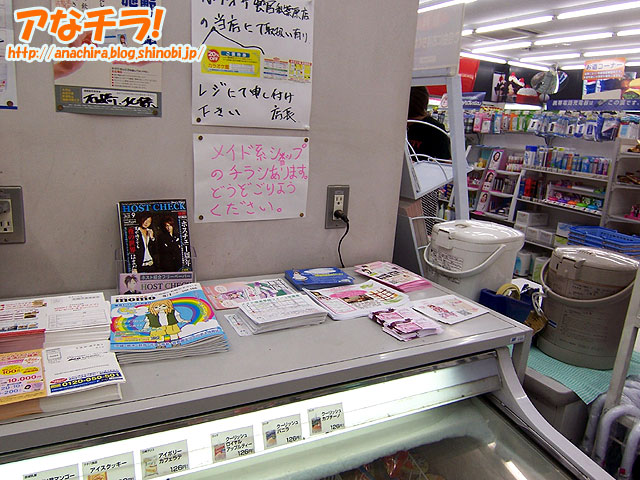 中央通りにあるampm外神田4丁目店では、入り口に近いアイス用の冷凍庫の上に「メイド系ショップのチラシあります。どうぞごりようください。」と記した紙を貼り、冷凍庫の上に7店舗ほどの萌え系飲食店やリフレクソロジー店のチラシ、割引券などを置いている。