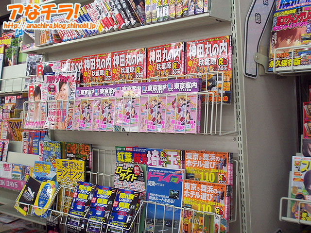 もう一つの例は、昭和通り側にあるデイリ-ヤマザキ秋葉原駅前店にある雑誌棚で、ここには萌え系飲食店を中心に紹介しているムックの「萌えるるぶ」が2種類、各10冊ほど常備されている。雑誌棚のかなり目立つ中央部分に2段ぶち抜きで常備というのだから、これも普通はあり得ない話だ。コンビニは売り上げデータを見て頻繁に商品を入れ替えるし、特に長いこと一等地に同一書籍を置くなんてことはまずない。よほど売れているのか、あるいは“質問逃れ”の対策として仕方なくやっているのか…。