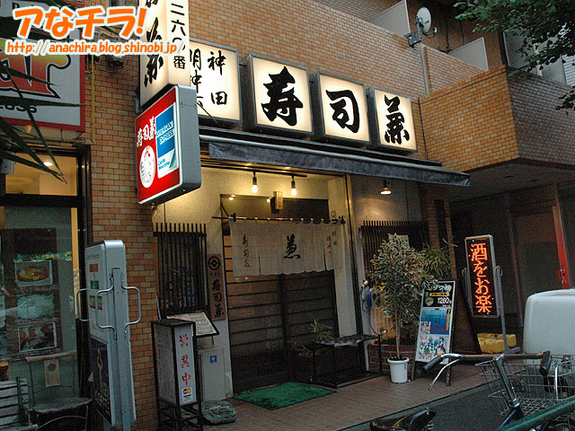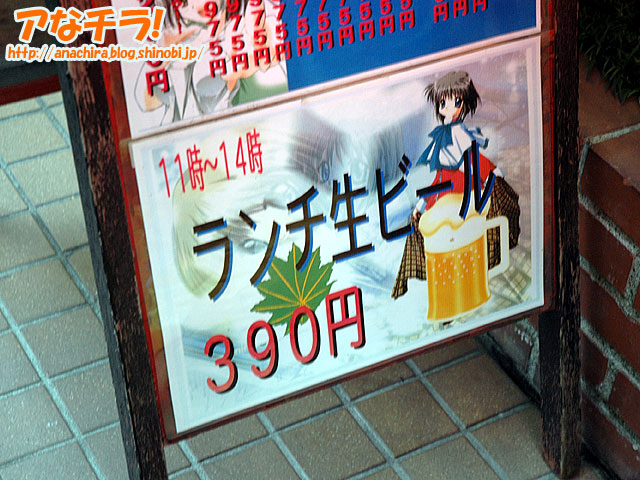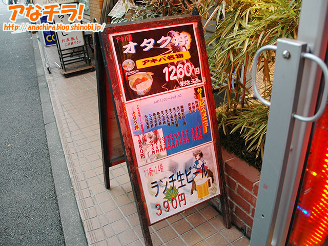 「寿司兼」という末広町に近いところにある寿司屋で、店構えも店内も基本的には普通の寿司屋だ。メニューの中身もごくまっとうな内容なのだが、なぜか店先には「アキバ系オタク丼」「アキバ名物」「アキバ名物!一度は食べてみよう」と書かれたインパクトのあるPOPが出ている。また、同時に萌え系の美少女イラスト付きで、まぐろ丼などのどんぶりメニューとランチ生ビールの価格をアピールする2枚のPOPも出ているのだから、これは普通じゃない。美少女イラスト付きでメニューを宣伝する寿司屋など、世界広しといえども、ここくらいなものだろう。店先の状態からは、とてもまともな寿司屋には見えないが、それでいて中身は普通なのだから、ある意味ではそっちのほうがビックリだ(笑)。
