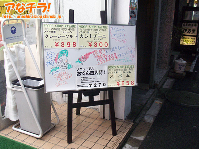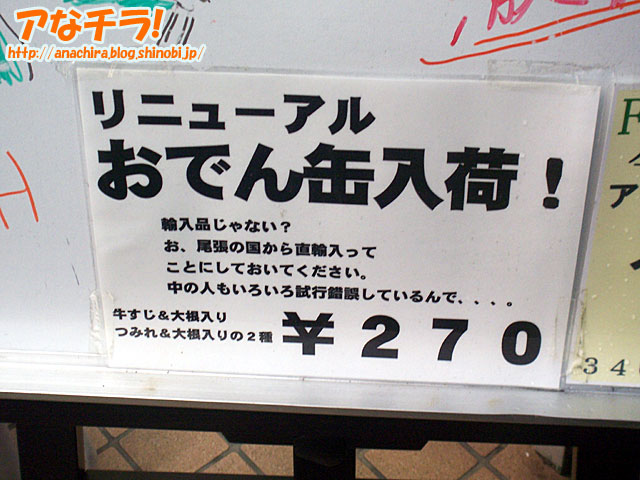 なんでもありの秋葉原。輸入食品店でなぜか店員がメイドのFOODS SHOP WATABE秋葉原店が、今度はおでん缶を売り始めた。輸入食品店なのに、なぜメイド?なぜおでん缶? この店はもともと池袋が本店で、何を思ったか秋葉原にまで進出してきて店員をメイドにするという快挙(?)を実行した不思議な店。輸入食品にメイドというのも妙な取り合わせだが、今度は秋葉原名物のおでん缶まで売り始めた。おいおい君んとこは輸入食品の店じゃないのかい…と誰もが突っ込みたくなるところだ。 現在、店先のホワイトボードには「おでん缶入荷!」と大きな文字の張り紙がある。そして、そこには店員自身も疑問に思ったのか、「輸入品じゃない?お、尾張の国から直輸入ってことにしておいてください。」と但し書きがついている。さらには「中の人もいろいろ試行錯誤しているんで、、、。」とも。メイドにおでん缶って…輸入食品店としては試行錯誤しすぎじゃないか(笑)。 ちなみに、おでん缶は天狗缶詰という名古屋の会社の製品で、今でこそ亜流がいろいろあるが、そもそもは、この製品が電器店脇の自販機で販売されたのが名物になったきっかけ。「尾張の国から直輸入」というのは、まっとうに通訳すれば「名古屋の会社から仕入れました」ということだ(笑)。 すっかり全国区の知名度になったおでん缶の人気もここまで来たか。今じゃ秋葉原では雑貨屋でも売っているし、ドン・キホーテでも販売中で、亜流(?)の製品もたくさんある。萌え系イラスト付きのおでん缶をオリジナルで作って売ってる電器店もあるくらいだ(笑)。 しかし、おそるべしFOODS SHOP WATABE秋葉原店。次は一体何をやらかしてくれるのだろうか。 FOODS SHOP WATABE (f) PR