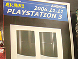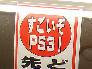 「すごいぞPS3!」として次世代ゲーム機PS3をほめていたPOP。アソビットホビーシティーで10月14日(日)に確認。POPでは「PS3」専用ソフト「アーマードコア4」のデモ映像を初めて放映ともうたっている。 PS3は11月11日に発売予定の次世代ゲーム機として世間から注目を浴びている。機能としてはHDDとBlu-ray Discドライブを標準搭載、出力端子には次世代HDMI端子を搭載する。大容量ディスクを活かした高画質、高精度なCGでゲームが出来るのが特徴。、ヨドバシカメラ秋葉原店で実機デモなども行われてもいる。 そんな注目度の高いハードウェアなのですが!今回の関連デモは残念ながら注目度が低かったようです。 注目が低かった原因としては、PS3実機によるデモではなかった、POPの「PS3」という文字が見えにくかった、高解像度だと思うPS3画質の映像がわかりずらかった(25型ブラウン管TV:東芝25S88に出力)ことが上げられる。 平たく言えばPS2のゲーム画面並にしかみえず、PS3の持ち味が分かり辛い。POPにある「凄い!」とことろをわかりやすく見せて欲しかった。 せっかくの注目ハードウェアなので、もっと大文字で「PS3」として、画面も40型くらいの大型にしていたら状況は変わっていただろう。 ちなみに、POPの中には「遂に登場!! PLAY STATION 3」するものもあった。予約方法などは未定。 □関連記事 (k)