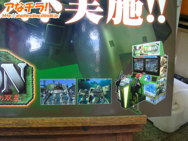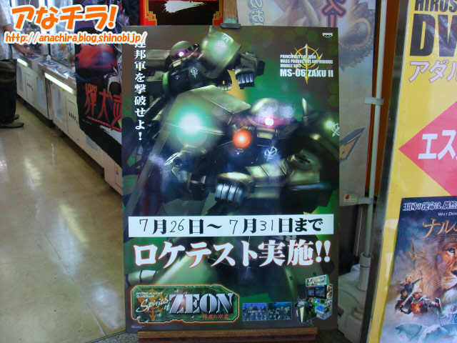 ガンダムの名脇役モビルスーツ「ザク」になって連邦軍モビルスーツと闘うことが出来るシューティングゲームのロケテストの告知看板。