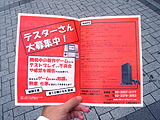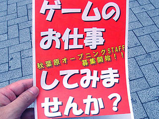 「ゲームのお仕事が出来る」のがうりの求人チラシ。募集していたのは株式会社デジタルハーツで、同社サラリーマンが業務としてJR秋葉原駅前で配布していた。 配布していた方の話によると「クリスマスシーズンを前にデバッカーを募集している」とのこと。どうやら同社はデバック専門の外注業者で、家庭用ゲーム機やPC向けゲームなどのソフトが集中して発売されるクリスマスを前に、人海戦術で対応するしかないデバッカーを確保したいということらしい。 また、なぜチラシで募集しているのかも聞いたところ、「募集雑誌に募集広告を出した場合、お金もかかるし、時間もかかるので即効性を求めて」との返事が返ってきた。以前にも書いたが、秋葉原の人手不足は相当深刻なようだ(※関連記事参照)。 「ゲームを遊んでお金が貰えて、勤務地は秋葉原」というのが甘美な言葉に聞こえる人や、「将来ゲーム業界で働きたい」としている人には面白いアルバイトかもしれない。 株式会社デジタルハーツ □関連記事 (k) PR