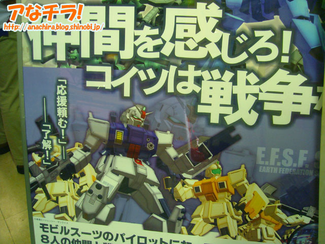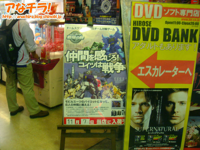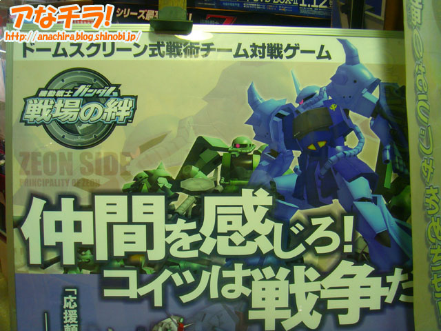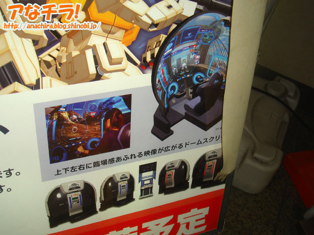 ゲーム筐体が半ドーム型という3Dゲーム「機動戦士ガンダム戦場の絆」の登場予定看板。ゲーム画面が上下左右にもある新型筐体を採用しているのが特徴。11月7日(火)に稼働予定。 いままでゲーム画面は正面のみというのが主体だったが、今回の筐体では正面に加え上下左右も画面になっている。これにより正面以外の画面を見るときに、画面の向きを変えることなく、プレイヤーが顔の向きを変えるだけで良いようになる。視界が広がると共に、3Dゲームの特性を活かした臨場感が味わえる。 今回のゲームはジオン軍チームと地球連邦軍チームに分かれて戦闘するもので、最大16台(8対8)での通信対戦が可能。味方チーム同士は通信で作戦を立てることも可能。 設置されれば人気ゲームとなることは必至だろう。 機動戦士ガンダム戦場の絆 (k)