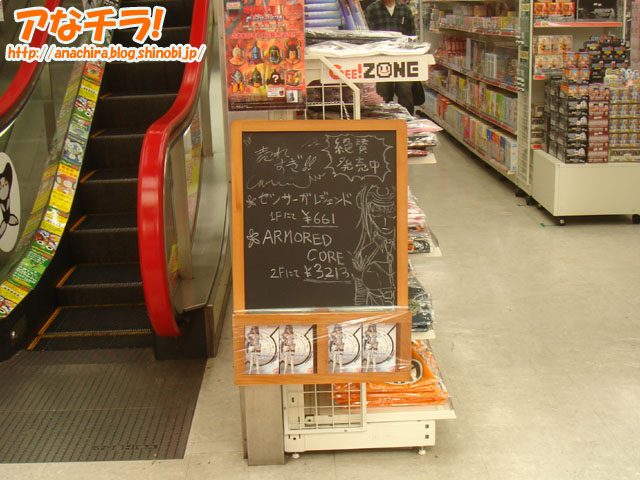 10月12日(木)に新たな看板を発見。場所はラオックスホビーシティーのエスカレーター前。 今回発見したときには「ゼノサーガレジェンド」と「ARMOED CORE」を「売れすぎ!!」として紹介していた。 いやー、これは楽しみな看板が増えてくれました♪ □関連リンク □関連記事 (k)