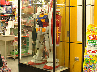全高が150cmという大型プラモデル「機動戦士ガンダム」が展示開始。展示しているのはアソビットキャラシティーで、ビームライフルの標準スコープには何故かオデン缶が乗せられている。 この大型プラモデルは1/12スケールハイパーハイブリッドモデル(HY2M)シリーズの製品。価格は35万円で、発光ギミックや機動音などの各種効果音も内蔵している。劇中で使用したビームライフルやシールドといった武器も付属する。同シリーズは2001年にも同じ150cmサイズのプラモデル「ザク」シリーズを販売したこともあり、こちらは約20万円という価格ながら約1,500個販売されたとも言われている。 まぁそんなことはどうでもよく、ホビーシティのディスプレイが等身大人形からロボットに変わったというのが興味深い。 最近萌え系ホビーグッズブームが一段落した感があり、新型ゲームやプラモデル市場が再度盛り上がりを見せてきているように思える。今回の看板娘(?)交代劇はもしかしたらそんな背景が影響しているのかもしれない。 □関連記事 (k)
