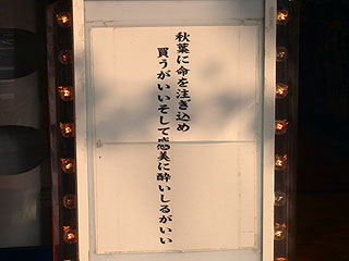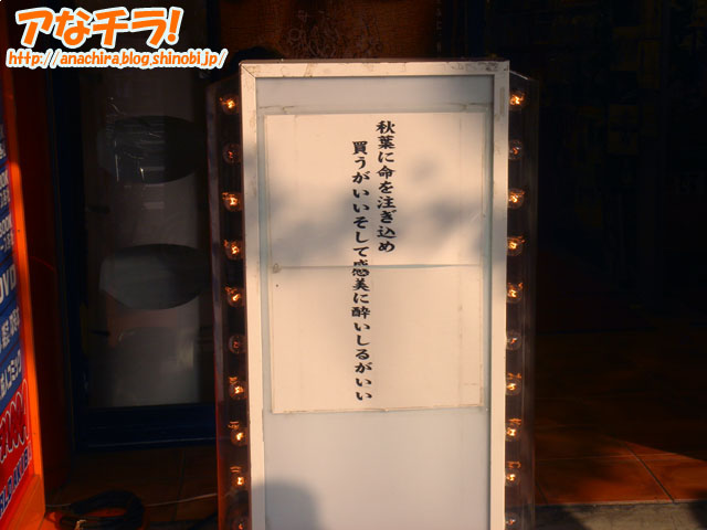 看板に書かれていた全文は「秋葉に命を注ぎ込め、買うがいいそして感美に酔いしるがいい」。