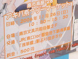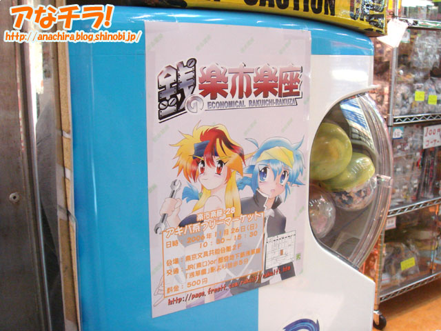 アキバ系のフリーマーケット「楽市楽座28」を開催する告知POP。ラジオ会館の通路に設置されていたガチャガチャに張られていた。 「楽市楽座28」はTOY・ガレージキット・トレカ・テレカ・同人誌・セル画・ゲームソフトなどを幅広く取り扱えるという。11月26日(日)の10:30~15:30に東京文具共和会館(浅草橋)2階で開催予定。現在ディーラー参加者を募集している。一般入場料は500円。 フリーマーケットでは出展者も掘り出し物を持ってくる可能性がある、「お宝モノ」を見つけられるチャンスかも。 しかし、アキバ系フリーマーケットって知らなかったけど27回も行われていたんですね。 アキバ系フリーマーケット楽市楽座 (k) PR