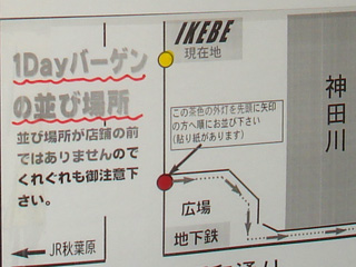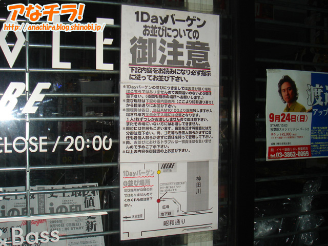 イケベ楽器リボレ秋葉原店の1DAYバーゲン告知POP。バーゲン開催日は9月10日(日)で入場は先着順となっている。 イケベ楽器は東京に13の専門ショップを抱える老舗楽器店。プロミュージシャンからの信頼も厚く、トラディッショナルなモデルやプロ仕様のモデルも多数そろえてある。1DAYバーゲンは毎年恒例で行われており、新品/中古の楽器が特価で販売されるので知られている。バーゲン対象製品は1点限りの為、ご購入は原則としてお1人様1点限りとさせており、バーゲン品のご予約も行っていない。 イケベ楽器リボレ秋葉原店は昭和通りの神田川沿いにあり、知る人ぞ知るスポットになっている。 同店ではPOPでバーゲンのルールを説明。午前11時から開店/販売を開始するが、 10日2時に確認したところ、すでに15人程度の整理券待ち列が出来ていた。もう朝晩は冷え込むようになったし、川沿いなので底冷えすると思うので風邪を引かないで欲しい。ひいてもいいのはバーゲンで買った楽器だけってことで・・・。 イケベ楽器 (k) PR