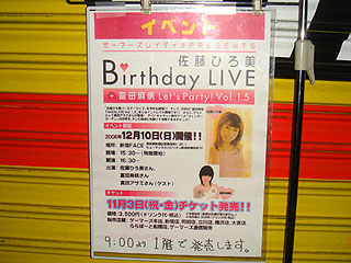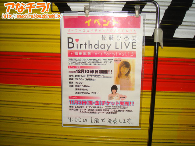 歌手「佐藤ひろ美」のバースデーライブのチケット販売が11月3日(祝/金)に発売開始。販売されるゲーマーズ本店ではファン20人あまりが徹夜で並んでいた。 徹夜で並んでいた人々は、寝袋で寝ていたり、携帯型ゲームで遊んだり、仲間と談笑していたりしていた。彼らのリラックスしきった態度を見ていると、ここは野外ではなくどこか友達の家なのではないかとも思えた。 楽しく徹夜も良いのだが、11月になり関東の夜はかなり冷え込むようになってきているのでくれぐれも風邪を引かないようにして欲しい。 佐藤ひろ美はゲーム「ギャラクシーエンジェルII~絶対領域の扉~EDテーマ「Cause your love~白いmelody~」やTVアニメ「護くんに女神の祝福を!」のED「MA・MO・RU!」で活躍中。 また、ライブにはTVアニメ「護くんに女神の祝福を!」のOP「Venus Dream」を歌う富田麻帆さんや 佐藤ひろ美オフィシャルウェブサイト[ひろみねっと] □関連記事 (k)