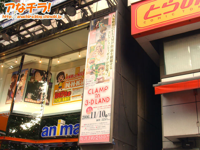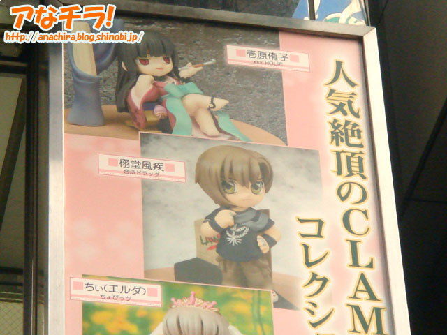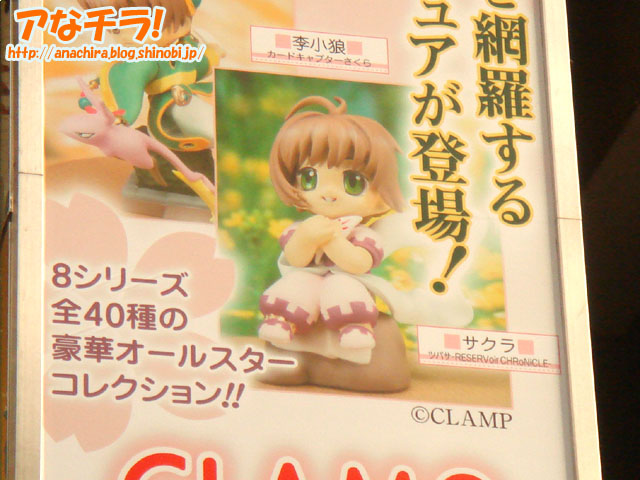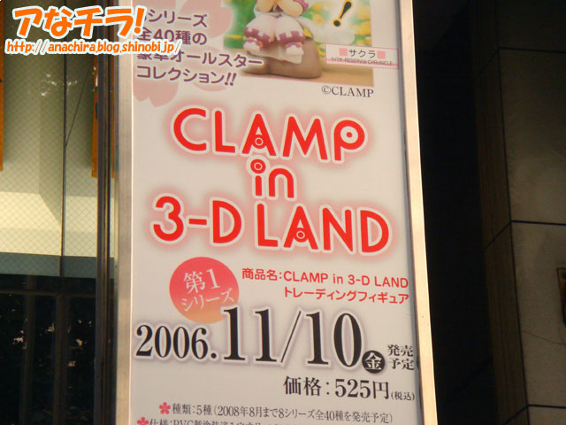 可愛くディフォルメされたCLAMPのフィギュアコレクション「CLAMP in 3-D LAND」の発売予告看板。11月10日(金)に発売予定。 「CLAMP in 3-D LAND」は人気漫画家CLAMPの作品を網羅するというフィギュアコレクションで、全40種を8シリーズに分けてリリースする予定。第1シリーズは「壱原侑子」、「栩同風疾」、「ちぃ(エルダ)」、「李小狼」、「サクラ」の5種。価格は1個525円。 今回のコレクションは女性向けも意識してか「可愛いマスコット」のような仕上がりになっている。全体的な雰囲気も漫画のキャラクターというよりは童話のキャラクターが立体化されたようになっているのもポイントが高い。 看板で告知していたアニメイト秋葉原店では、同製品の発売記念イベントとして11月1日(水) ~ 30日(木)の期間中「CLAMPフェア in アニメイト」を開催する予定。期間中、CLAMP関連商品(グッズ・AV・ゲーム等)購入者にポストカード(1枚/1,000円毎)をプレゼントするという。 CLAMP in 3-D LAND トレーディングフィギュア □関連記事 (k)