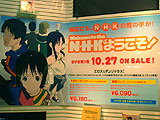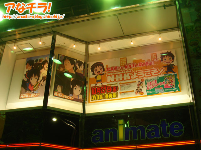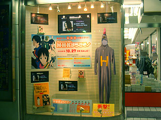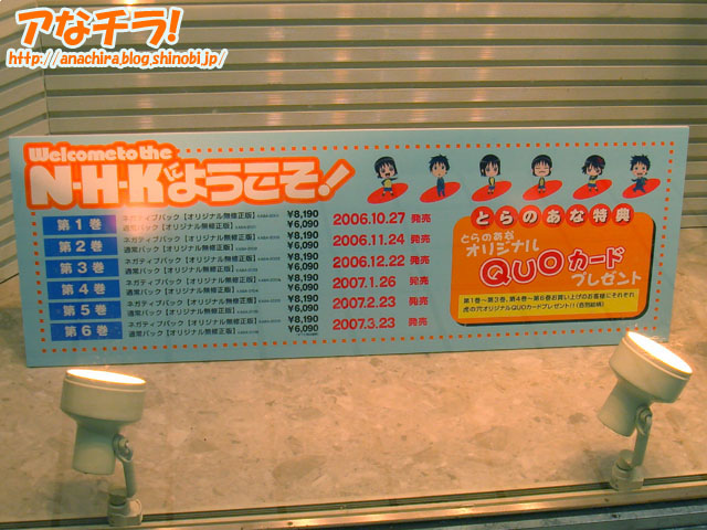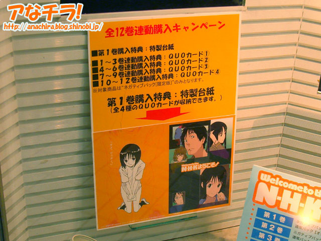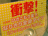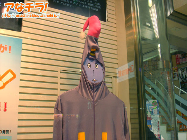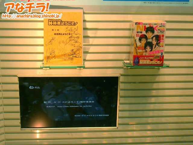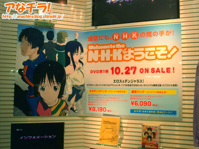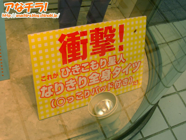 TVアニメ「N・H・Kにようこそ」の人気キャラ「ひきこもり星人」になれるタイツ。10月27日(金)に発売予定のDVD1巻ネガティブパック版のおまけの一つ。展示されているのはとらのあな秋葉原1号店。 「ひきこもり星人」とは、ひきこもりの主人公佐藤くんの妄想内に現れる謎の宇宙人。作品中では妙に良い味を出していた。今回の「なりきり全身タイツ」には伏せ字になっている「○っこりパッド」も付いているが、これは頭部に付いているパーツのこと、なんとなく股間に付けるものをイメージしてしまうがそうではない。 この「ひきこもり星人全身タイツ」を着て、作品中と同じく「ヒヒヒヒヒヒ」と笑えば、君もマスターオフ引きこもりになれるかもしれない(推奨はしません)。 ちなみに、TVアニメ「N・H・Kにようこそ」のあらすじは、マスターオフ引きこもりの主人公「佐藤達広(cv/小泉豊)」が自分が4年間も引きこもっているのは巨大組織「N・H・K(日本ひ○こ○り協会)」の仕業なのだと!気がつくところから始まる。そんな時彼の前に「中原岬(cv/牧野由依)が今の生活から脱出し、社会復帰のサポートをしてくれるという、さて、彼の将来はどうなるのか?というもの。 今回のディスプレイでは、先述の全身タイツの他にDVD全6巻の発売予定やとらのあな特典のQUOカード、台本なども展示されていた。 また、看板に「当店にも、NHKの魔の手が!」とされているのは、恐らくお隣のアニメイトに以前から「N・H・Kにようこそ」のDVD発売予告看板があったためだろう。 N・H・Kにようこそ! □関連記事 (k)
