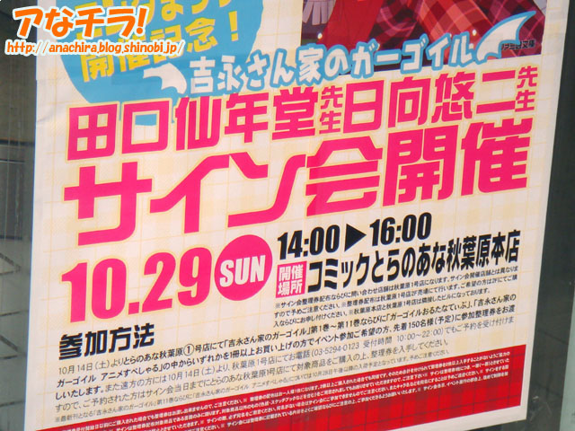 人気小説「吉永さん家のガーゴイル」の最新11巻の発刊を記念してのサイン会開催告知POP。10月13日(金)にとらのあなで確認。 「吉永さん家のガーゴイル」は、動く石像「ガーゴイル」を商店街の福引きで引き当てた吉永さん一家を中心に世界的に有名な怪盗や光線を出して空も飛べるライバル石像、東南アジア出身(?)の植物兵器などを交えたドタバタを町内レベルで描くコメディー作品。 今回のサイン会は作者:田口仙年堂さん/イラストレーター:日向悠二さんが参加して10月29日(日)14時から開催予定とされている。参加には10月14日 (土)から配布する整理券(先着150名)が必要。整理券はコミックとらのあな秋葉原1号店で「吉永さん家のガーゴイル」シリーズを購入するともらえる 。 同作の主人公(?)ガーゴイルはご町内の平和を守ることで有名。このサイン会でサインを貰えれば「交通安全」や「泥棒除け」のご利益をうけることが出来るかもしれない。 ただ、ガーゴイルは彼の主人「吉永双葉」から毎回蹴るは投げられるはの迫害をうけているので、「家内安全」にはご利益がないと予想される。 吉永さん家のガーゴイル(ファミ通文庫) □関連記事 (k)