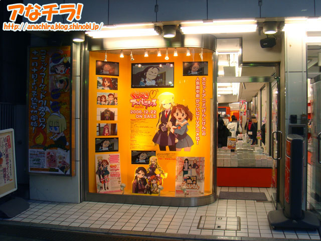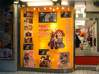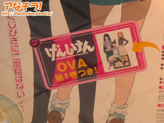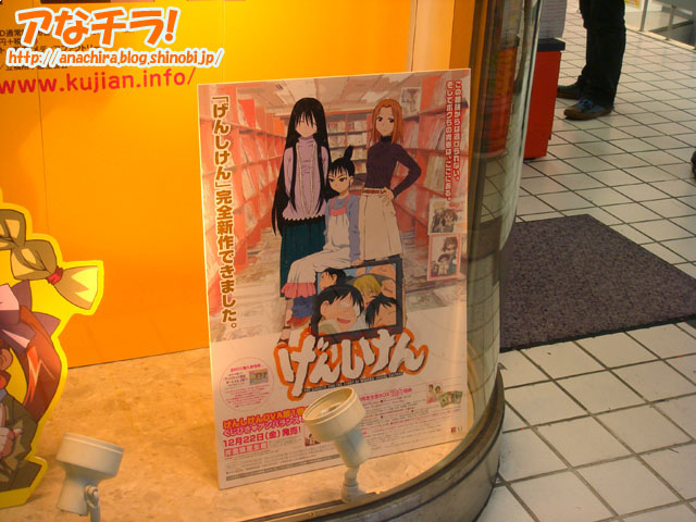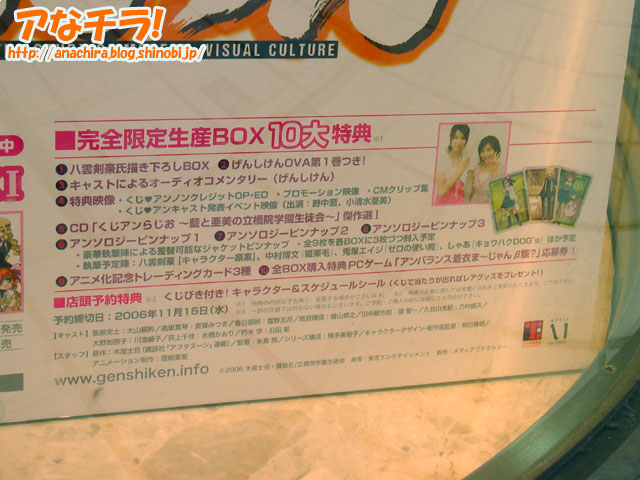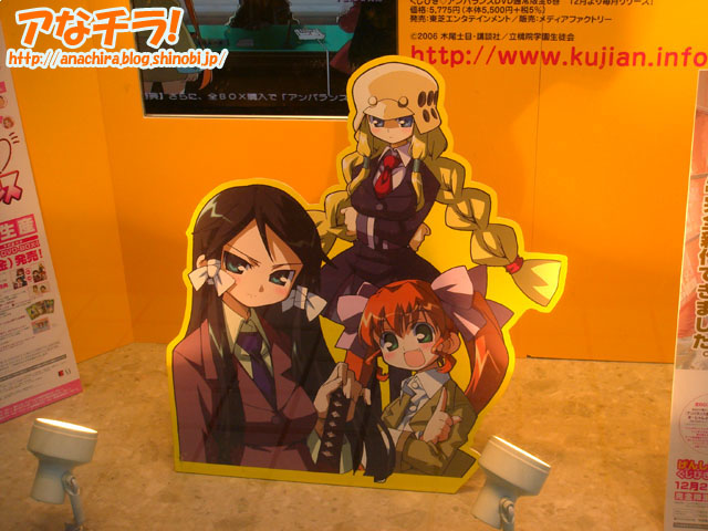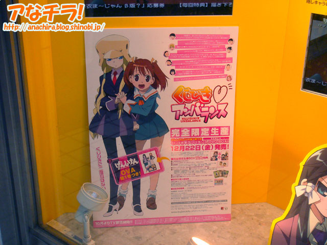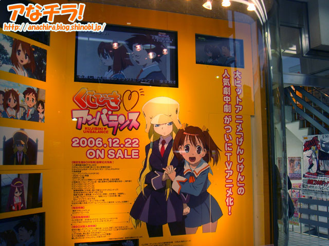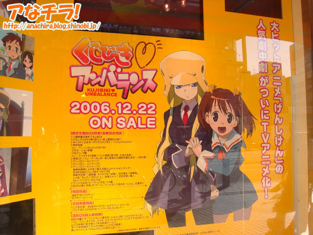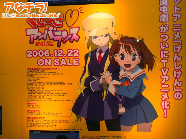 TVアニメ「くじびきアンバランス」のDVD販売告知ディスプレイ。発売日は12月22日で、初回限定版には10大特典がつくという。特典最大のウリは新作オリジナルアニメ「げんしけん」第一巻が付属すること。 TVアニメ「くじびきアンバランス」は今年10月から放映が開始されたばかりのもの。もともとは漫画「げんしけん」の中で出た架空漫画だったのだが、「げんしけん」が人気化するとともに「くじびきアンバランス」の人気も高まり、小説や漫画になった。そしてTVアニメ「げんしけん」がDVD化された時に特典としてオリジナルアニメ「くじびきアンバランス」が3話作成されもした。愛称は「くじあん」。 TVアニメのストーリーは、どんなことでも「くじ」で決める立橋院高校に通う不運な主人公「榎本千尋」が幼なじみの「秋山時乃」と共に次期生徒会役員に選ばれたことから様々なトラブルに巻き込まれることになるドタバタコメディー。そして、もう1人の幼なじみ現生徒会会長「律子・キューベル・ケッテンクラート」とを交えた3角関係を描くラブストーリーも見所の一つとなっている。 今回のDVDは全3巻で予定されており、毎巻「げんしけん」のアニメが特典として付く。本編とオマケが前回の逆パターンとなっているのが面白い。 12月末販売のDVDの予告を約2ヶ月も前からしていることに、同作の人気の高さと期待が伺える。 くじびきアンバランス □関連記事 (k)