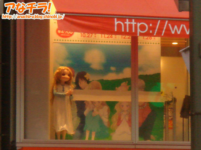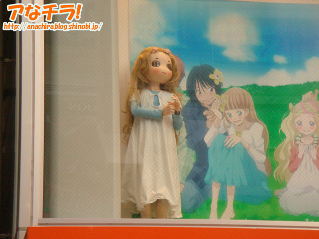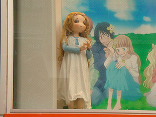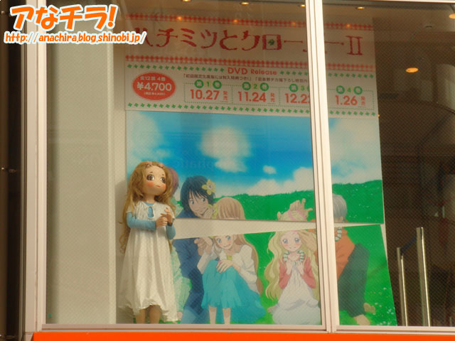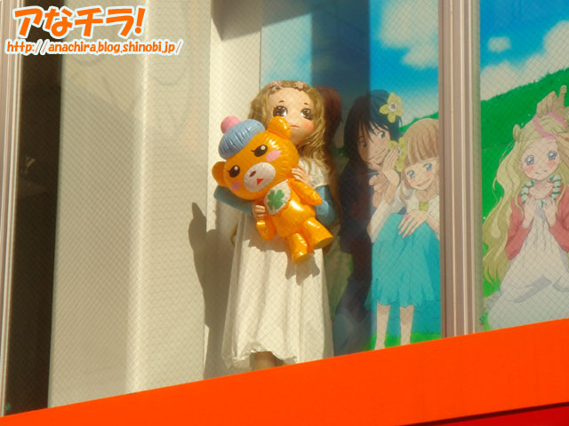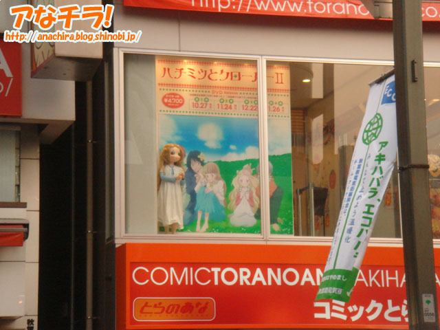 とらのあな秋葉原本店2階の「はぐ」人形はクマ人形を抱いていたり抱いていなかったりしている。 「はぐ」とは漫画「ハチミツとクローバー」のヒロインの愛称で本名は「花本はぐみ」。「ハチミツとクローバー」とは主要キャラ全員が片思いしているという学園ラブストーリー漫画。天才彫刻家の少女「花本はぐみ」に恋する2人の男子大学生「竹本祐太」と「真山巧」の3角関係を中心に展開している。TVアニメになったこともある人気作。 今回確認したはぐ人形は、TVアニメ第二期のDVD販促用として飾られたもの。人形の後ろには背景にもなっているDVD「ハチミツとクローバーII」全4巻の広告看板もある。 さて、この「はぐ」人形は最初に確認した10月21日(土)には手に何も持っていなかったのだが、25日(水)からクマの人形を持ち始めた。さらに観察していると1日の中でもクマを持っていたり、持っていなかったりもしている。理由は不明だが、いろんな表情が見れて楽しい。 そして蛇足だが、背景の看板の下半分も22日(日)には取れかかっていて、23日(月)には取れてしまっていたこともある。 ハチミツとクローバー □関連記事 (k)