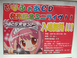 メイド喫茶「ぴなふぉあ」メイドユニットの無料ライブ「無料バレンタインライブinラムタラ」を告知するPOP。CD「うるとら☆はっぴー」の発売を記念して行うもので、日時は2月12日(月)の13時で、場所はラムタラの7階。 ライブの内容は、バレンタイン直前ライブ、MCなど、撮影はMC中のみ可能とされている。また、CD購入者へはラミネートカードがプレゼントされる。 この手のイベントは通常入場条件としてCD購入などが必要となっていたが、それをフリーにするというのは珍しい。これはライブ名にもなっているとおりぴなメイドからファンへのバレンタインプレゼントなのだろう。 ちなみに、このライブはぴなメイド「みつ」さんの卒業直前イベントにもなっている。 メイドカフェぴなふぉあ (k)
