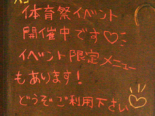 体育祭イベントの告知看板。チアリーディングや体操服(短パン)等体育祭関連の服装で接客してくれる。看板に期間は記載されていないが9月13日(水)限定と予想される。イベント限定メニューもある。 先週9日にメイド服を新調した事を報告したが、日にちを置かずに特別衣装のイベントを実施、 萌え系の店にしては体操服の下がブルマじゃないのが新鮮。っていうか短パンの方が生々しいような気がするんですが気のせいですか?そういえばメイドさんが赤白の鉢巻してましたが、赤組白組でなにか競ってたのかな? メイドカフェ カフェドール東京(Cafe Doll) (k) PR