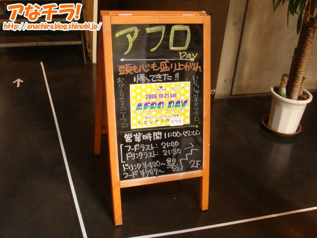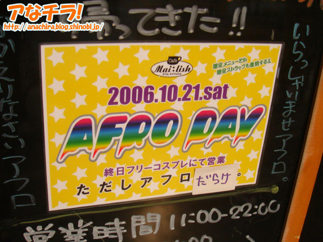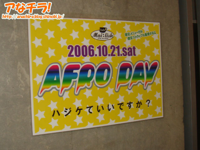 アフロヘアで接客するというイベント「アフロDay」の告知看板。10月21日(土)にカフェメイリッシュが開催。POPには「ハジケてもいいですか?」とノリノリで営業することも書かれていた。 「アフロDay」ではメイドさんが直径30cmはあろうかというアフロヘアを付けているだけでなく、言葉使いも語尾に「~アフロ」と付けるアフロ語になっていた。また、服装はフリーコスプレだったのだが、昼はヒラヒラエプロンドレス+アフロの「アフロリ」、夜はセクシー衣装+アフロの「セクシーファンキーアフロ」で合わせられていたとのこと。 アフロイベントでは店内はダンスホールのような雰囲気にされ、限定メニューも用意。アフロストラップが復刻されたり、お客用に「貸しアフロ」も準備されていた。 このイベントに参加した人の中にはアフロ語に洗脳されて「メイド喫茶に行ってきたアフロ」とか「アキバは楽しいアフロ」とか、しばらく語尾がおかしかった人もいたとかいなかったとか(嘘です)。 メイド喫茶カフェメイリッシュ(Cafe Mai:lish) □関連記事 (k)