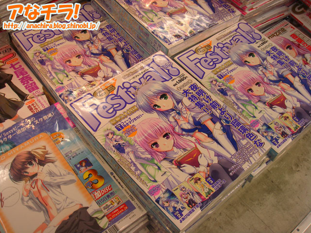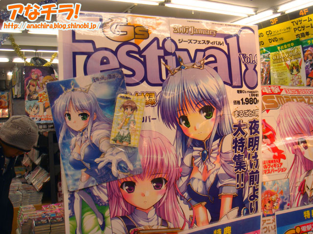 「フィーナ姫(抱き枕)がホームスティに」というのがウリのPOP。ゲーマーズ本店が販促用に入り口で飾っていた。 「フィーナ姫」とはこのblogでも何度か紹介したTVアニメ「夜明け前より瑠璃色な」のヒロインで、月の姫なのだが地球の一般人の家にホームスティにくるという設定。今回は雑誌「電撃G's Festival! vol.6」が同作の特集を行い、付録として「フィーナ抱き枕カバー」がついている。 そのほかにも下敷きとパスケースも付いている。 今回展示している「フィーナ」抱き枕の絵柄は顔は少し恥じらいながらも期待しているまなざし、胸は両手で隠している奥ゆかしさ、ロングスカートがはだけてフトモモが見えているというもの。雰囲気としては先にベットに入って待っているという感じだ。 いくら可愛い娘でも抱き枕がホームスティに来たら親御さんが卒倒してしまう可能性が高い、しかし、「この娘は月からきたんだよ」と言い張れば親御さんも「もしかしたら月世界人は2次元人なのかも」と思いこみ、家庭にすんなりとけ込めるかもしれない。 人気商品らしいので、フィーナ姫をホームスティに迎えて夜明け前を一緒に過ごしたい人はお早めに・・・ 夜明け前より瑠璃色な-Brighter than dawning blue- (k)