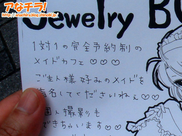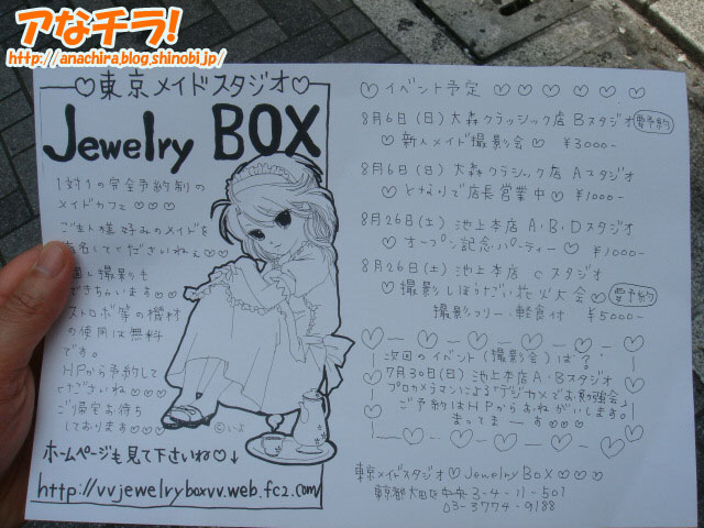 大田区の東京メイドスタジオ「Jewelry BOX」のチラシ、JR秋葉原駅前でメイドさんが配布していました。 完全予約制でメイドさんとの1対1で個人撮影が出来るのがウリ、ストロボなどの機材の貸し出しや新人メイド撮影会等、様々なイベントも企画されている。 メイドさんに聞いた所スタジオでメイド服以外のセーラー服やチアガール等様々衣装を用意しているし、制限はあるが持参した衣装を着てもらうことも出来るとのこと。 東京メイドスタジオ「Jewelry BOX」 (k) PR
