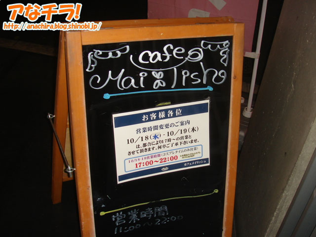 カフェメイリッシュの営業時間変更のお知らせPOP。10月18日(水)、19日(木)の期間は17時~22時までの営業となる。 同店は様々なイベントを行うことで有名。この後もイベント予定が目白押しなので、ここで一旦営業時間を短縮して体を休めているのかもしれない。 今後予定されているイベントは10月21日(土)に「アフロDay」、10月28日(土)~31日(火)に「ハロウィンDay」など。 □関連記事 (k)
