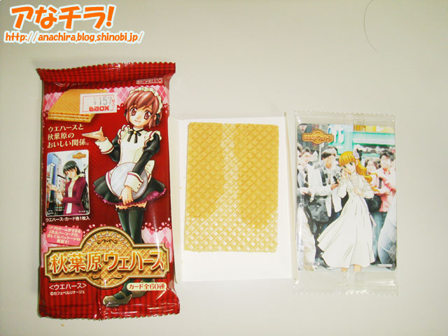 また、パッケージにメイドさんを描いているので、メイドファン向けに絵柄はメイド服中心かと思っていたが違うようで私服姿の絵柄もある、商品名が秋葉原ウェハースなのでメイド服じゃなくてもいいのだろうが、正直メイド服でないと絵柄的に萌え要素は低くなってしまう。