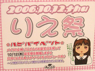 メイリッシュのメイドさん「りえ」さんの誕生日を祝って行う「りえ祭」の開催告知看板。10月12日(木)17時から開催。 「りえ祭」は、りえさん自身がプロデュースしたとされ、メイドさんが「和服」姿で接客するのが特徴となっている。そのほか、ラミカ付メニューや「りえ祭」記念ボトルも用意されているという。 看板には今回誕生日を迎える「りえ」さんを女神とたたえているが、イベントは和服あわせとなっていた。せっかくなので「天照大御神」や「ギリシャの女神」、「ああ、女神様」などの女神様系の衣装でコピー文と統一してもよかったのかもしれない。 同店は以前にもメイドさんの誕生日イベント「ゆえ祭」を開催しており、その時も誕生日を迎えるメイドさん自身がイベントをプロデュースしている。自身の誕生日をイベントとして祝うことが慣例になっていると思われる。 メイド喫茶カフェメイリッシュ(Cafe Mai:lish) □関連記事 (k) PR