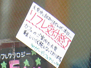 イベント「体育祭デー」で「リフレ受付終了」したと告知するPOP。10月9日(祝/月)の夕方5時位にガーデンフェアリーで確認。 同店のリフレクソロジー受付終了時間は通常午後8時30分なのだが、この日は午後5時時点で受け付けを終了していた。先日「ブルマを履くのか!?」として紹介したガーデンフェアリーの「体育祭デー」が盛況だったことが伺える。POPには「カフェの案内も大変難しい状態」とも書かれていた。 個人的には看板に描かれていた通りに「ブルマ」を履いた娘さんがいたのか?が気になります。 ガーデンフェアリー □関連記事 (k) PR