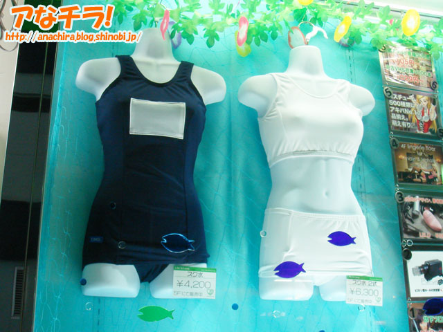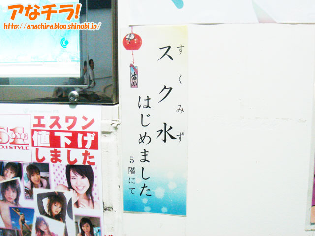 「スク水はじめました」と涼やかに書かれたPOP。アダルトグッズ販売のm'sが一階外壁をリニューアルしてスクール水着の販促用として展示。 m'sは一年中スクール水着を売っているにもかかわらず、いかにも夏の季節限定商品ですよといった風にうたっているのが上手い、こんな粋なPOPを見せられては思わず店内に入って「今日もあついねー、スク水一枚もらおうか」と言ってしまいたくなるものだ。 pop life department m's(アダルトコンテンツを含みます、18歳未満禁止) (k) PR