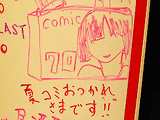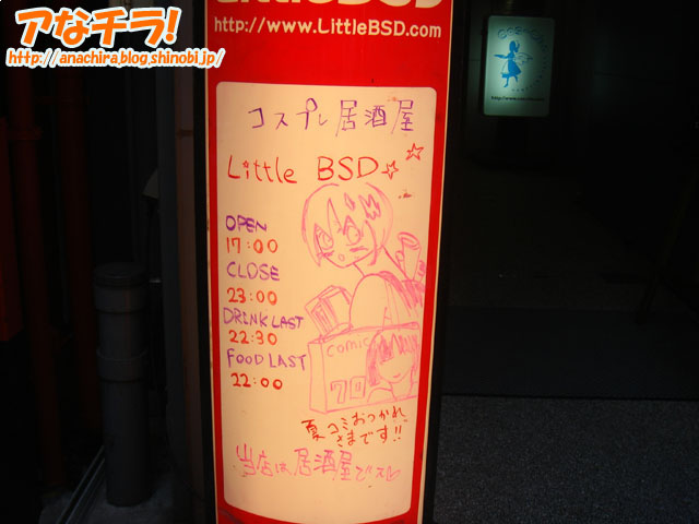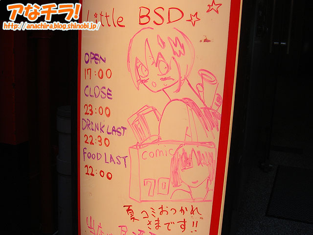 夏コミ(コミックマーケット70)参加客向けに慰労の言葉を書いていたLittle BSDの看板。 8月13日は夏コミの最終日ということで、夏コミに参加していた方々が秋葉原に買い物や打ち上げに来ていました。そんな夏コミ参加者向けに、「おつかれさまです。」と優しい言葉をかけているイラストが描かれた看板。イラストは、コミケ参加者をイメージしたものらしく、たくさんの同人誌を胸に抱え、肩には大型紙袋を、背中にはポスターをさしたリュックサックを背負っている。 イラストの下には「当店は居酒屋です」とさりげなく書かれており、夏コミを終えて打ち上げ場所を探している人向けに、当店で打ち上げをしませんか?と誘っているものと思える。 今年の夏コミ3日目の会場は、一日中の真夏日に加え、会場の異常なまでの人口密度による高湿度で、歩いているだけで汗が止めどなく流れて、脱水症状になりそうな厳しい日でした。そんな中、イラストにとはいえ、こんな優しい言葉をかけられたら、他の場所で打ち上げを予定していても、中に入って「いやー、今日は疲れたよ」とグチをいいつつビールを一杯飲みたくなってしまいます。 アキバ系コスプレ居酒屋 小悪魔の宴LittleBSD (k) PR