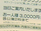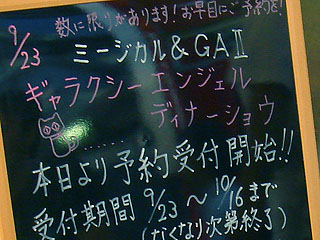 「ギャラクシーエンジェル」ディナショーの予約開始を告知する看板。掲示していたのはゲーマーズ本店。 ブロッコリーの人気キャラ「ギャラクシーエンジェル」とのディナーショーが12月30日(土)、31日(日)に計3回行われる。ゲーマーズ本店では9月23日(土)から予約を開始した。10月26日まで受け付けているが、数が無くなり次第受付を終了する。また、申し込み受付は1人各日2枚まで予約が可能で、参加費30,000円の内金3,000円が必要となっている。予約特典もある。 参加予定の声優はミルフィーユ・桜葉(GA)役「富田麻帆」、蘭花・フランボワーズ(GA)役「小出由華」、ミント・ブラマンシュ(GA)役「白川りさ」、ヴァニラ・H(GA)/ナノナノ・プディング(GA2)役「明坂聡美」、烏丸ちとせ(GA)/リリィ・C・シャーベット(GA2)役「中山恵理奈」、アプリコット・桜葉(GA2)役「稲村優奈」、アニス・アジート(GA2)役「花村怜美」、カルーア(テキーラ)・マジョラム(GA2)役「平野綾」ほかとなっている。 ディナーショーはミュージカルショウを見ながら、豪華な食事を食べられるものとされ。帰りにはお土産もつくという。 会場はサンシャインプリンスホテル3F「天覧」、席順は当日案内となっており、当日の服装にはジャケットの着用を求められている。 あー、もう年末っすか・・・はやいなぁ ちなみに、Windows専用ゲーム「ギャラクシーエンジェル」超限定版ミントパック(当時12,800円)がイオシスで3,000円で発売されている(9月23日時点)。 当時手に入れ損ねていたミントファンにはチャンス! ブロッコリー (k)