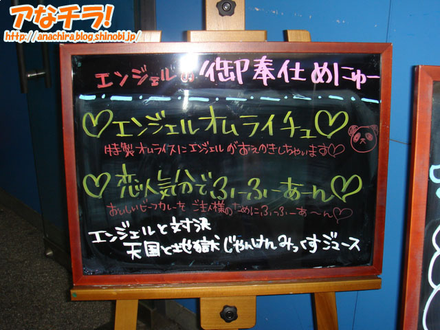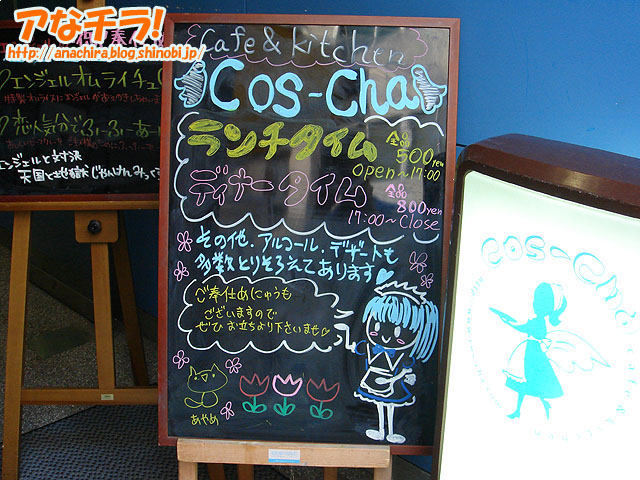 Cos-Chaの看板が御奉仕めにゅー版になっていました。 同店のメニューの中でも有名な3点のみをピックアップ、この看板の書き方は通常のアキバ人向けと違い、コミケ期間中に秋葉原に来たメイド喫茶初心者向けのものと思われる。 お絵かきオムライスや、メイドさんに食事を一口食べさしてもらえるといった、バラエティや雑誌で有名になったメニューを試してみたい人に、大きな文字で書くことで見つけてもらいやすくしているのだろう。 「恋人気分でふーふーあーん」はやってもらいたいが、気恥ずかしくてオーダーするのに度胸がいりそう。 Cafe&Kitchen Cos-Cha (k) PR