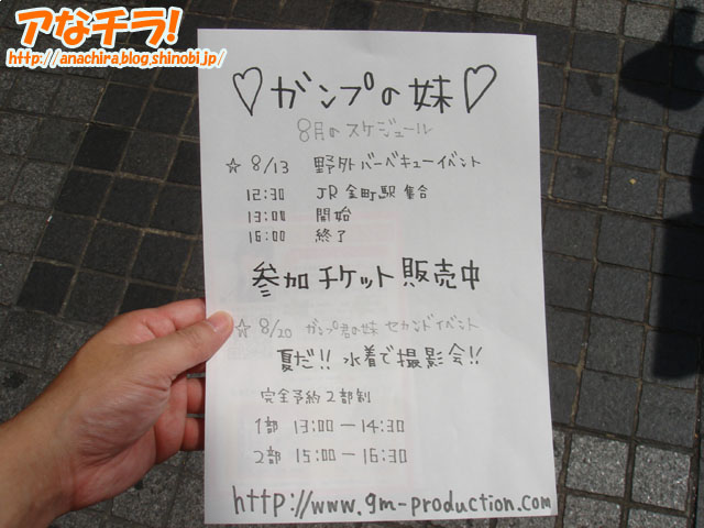 コピー紙にマジックで書いた様な手作り感あふれるチラシ。ガンプくんの妹の8月のスケジュールと参加チケット販売を告知している。 ガンプくんの妹(チラシは何故かガンプの妹と略称)はお客が「お兄ちゃん」となり、「妹達」と普通の生活を体験出来る参加型イベントをコンセプトにしている、HPによると自然体で身近な妹と御飯を食べたり、カラオケに行ったり、買い物に行ったりする事が出来るそうです。 実はこの一見手抜きとも取れる様なチラシも、妹が手作りで一生懸命に作ったんですよと言うことなのかもしれません。何にせよ、最近ビジュアルに凝ってきている秋葉原駅前で配られるチラシの中で、逆にシンプルにすることで目立っていました。 ガンプくんの妹 (k)