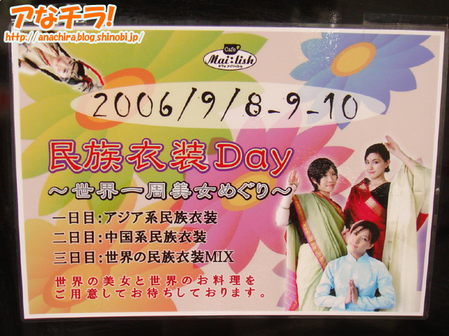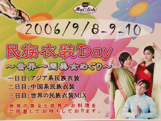 毎日通えば秋葉原にいながらにして世界一周の気分が味わえるかも。しかし、「世界一周」とされているが、3日目の世界の民族衣装MIX以外はアジア地域、いっそアジアの民族衣装にしたほうが良かったのでは?。