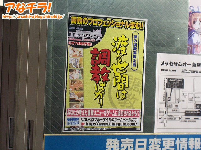 女性に首輪をつけ手枷足枷をして長期間監禁し、陵辱、暴行を繰り返し、ついには死者まで出たというSMプレイを通り越した地獄絵図のような事件が報じられ、世間は恐怖と悲哀で震撼しているさなか、それでも秋葉原という街の一部はまったくおかまいなし。 18禁ゲーム専門ショップのメッセサンオーV別館では、そんな中でも店先に堂々と女性を陵辱するゲーム「エルフィン・ローズ」のポスターを張り出し、そこにはお大きく「渡る世間は調教ばかり」のタイトル文字も。これは、このゲームのプロモーション用キャンペーンの名前で、脳天気にも「あなたの考えた調教メニューがゲームに追加されるかも!?」と、SM調教メニューを公募している。ポスターには「調教のプロフェッショナル求む!!」「夢の調教実現企画」とも。 性癖の方向性はそれぞれの人間が持っているもので、それ自体はとやかく誰も言えないが、それを社会性と照らし合わせて自分でコントロールすることは必要だろう。秋葉原という狭い空間も社会全体の中の一部として機能しているわけで、そこに集まる人間も社会の動向は知っておくべきだし、自分たちの趣味を守るためにもタイミングややり方は考えるべき。やるなら18禁の制限加えた上で店内でやったらいい。だいたい子供も通る公道に向かってこんなポスター貼るなんて、秋葉原という街にあぐらをかいた視野狭窄の行動としかいいようがない。 「渡る世間は鬼ばかり」をもじったキャンペーン名だが、あんまり無自覚非常識にただ野放図にやっていると、自分で鬼を呼んでしまうぜよ。石原慎太郎都知事という鬼は、まだ寝ているのか? メッセサンオー (f) PR