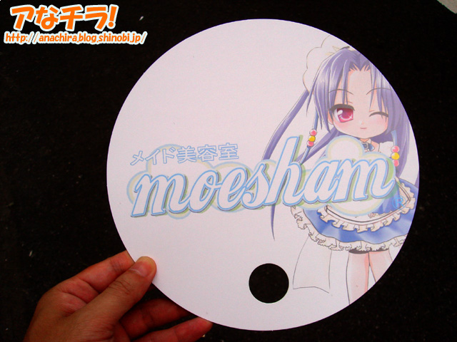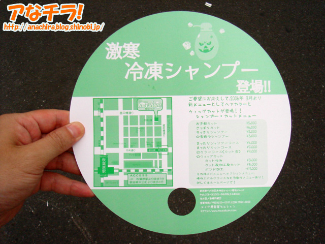 極悪面のキャラクターマークが付いたウチワ。配布しているのはメイド美容室モエシャン。 表面は可愛い女の子イラスト、裏面にメニューが書かれている販促ウチワ。同店の新メニュー「檄寒冷凍シャンプー」のキャラクターマークが某社スナック菓子のハバネロマークに似ている。 「檄寒冷凍シャンプー」は以前看板で確認していたが、今回は販促ウチワでも確認。相変わらずサービスの内容は見当も付かない。しかし、こんな極悪面をしたのがマスコットキャラクターになるくらいなので、シャキッとするようなさっぱり系シャンプーというよりは、ガス式スプレーで冷やされる強烈なシャンプーをイメージしてしまう。 正直、怖いモノ見たさで試してみたい気もする。 メイド美容室 モエシャン(moeshan)