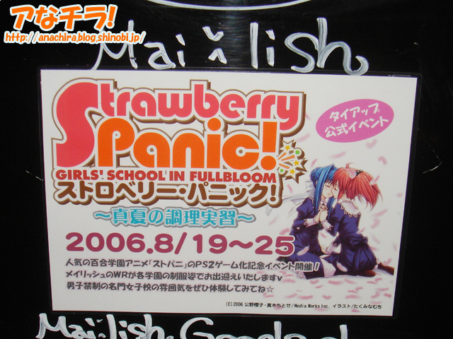 ゲーム「ストロベリーパニック」との期間限定タイアップイベント告知看板。開催はカフェ・メイリッシュ。期間は8月19日(金)~25日(金) ストロベリー・パニックは深夜枠アニメで女子校を舞台にした百合モノとして人気だった作品で、8月24日(木)にPS2ゲームソフトが販売される。メイリッシュでは期間中、ゲームに登場する3種類ある学園の制服姿でWRさんが接客をしてくれるという。 メイリッシュは日頃から人気の店舗だが、タイアップ初日は開店直後から店の外まで行列が出来ており、いつもよりにぎわっている様子だった。 お店の中ではWRさん達同士の会話は、百合風に「お姉様」や「~ちゃん」とかになっているのだろうか? ストロベリー・パニック (k) PR