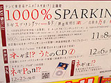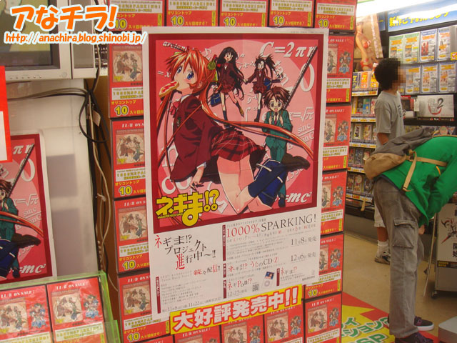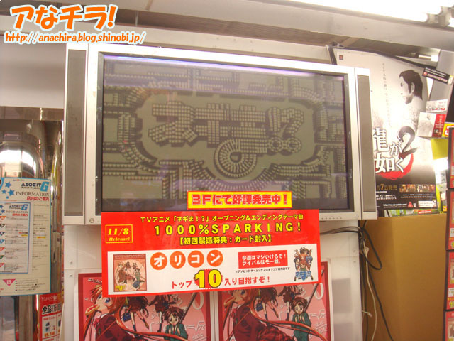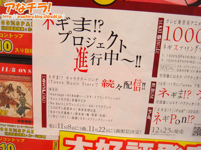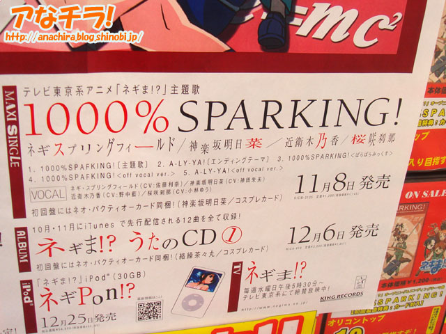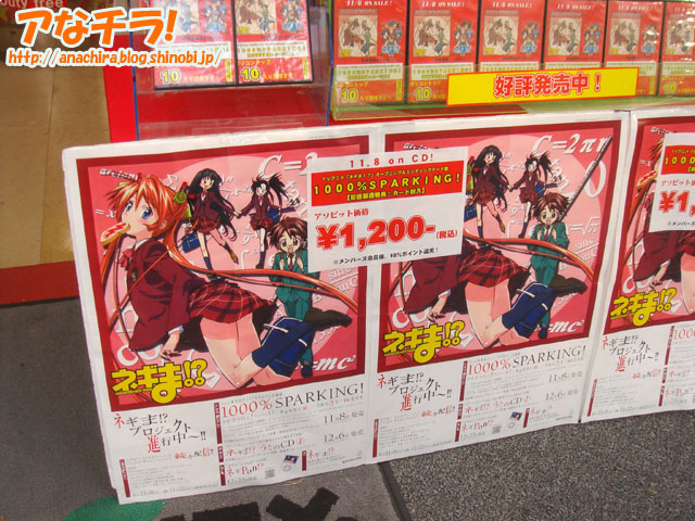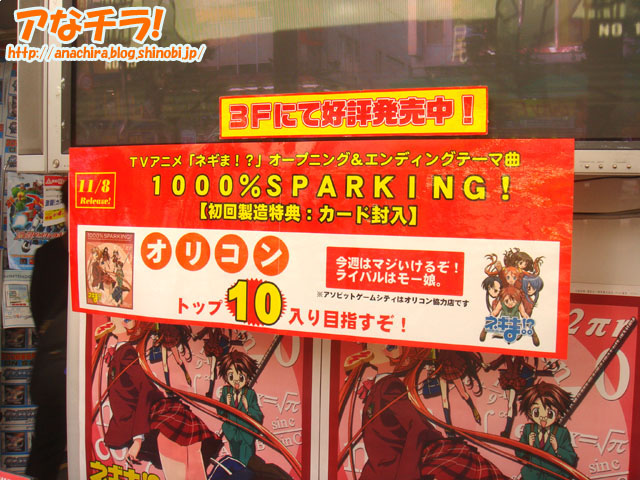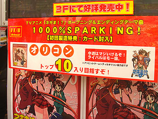 TVアニメ「ネギま!」主題歌CD「1000% SPARKING!」の発売告知POP。掲示していたのはラオックス アソビット キャラシティー。POPでは「オリコントップ10位入り目指すぞ!」という意気込みも書かれていた。 アニメ「ネギま!」のCDと「オリコン」との因縁は深い。2005年度に同作はCD「ハッピー☆マテリアル」を歌手を替えて6ヶ月に渡りリリース、全部がオリコントップ10に入る偉業を達成した。このときは某巨大ネット掲示板で「アニソンを日本音楽界のトップにする」として盛り上がり、かなり1位に肉薄したが、残念ながら最高位は3位だった。 今回のPOPはそのことを煽って販促に繋げたいとしているのだろう。ただし、今回は巨大ネット掲示板ではオリコン騒動は盛り上がっていない、その為か意気込みがトップ10以内と控えめになっているのだろう。 さて、今回の「ねぎマ!」vs「オリコン」の勝負結果はどうなるのでしょうか? アソビットシティ □関連記事 (k)