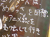 「めがっさ」という意味不明な目標を掲げている看板。ゲーマーズ本店がアニメ雑誌12月号の販促用に付録などを多く貼り出しているのをさしていると思われる。 「めがっさ」とはTVアニメ「涼宮ハルヒの憂鬱」の名脇役「鶴屋さん」の口癖で、ニュアンス的には「とても」や「凄い」とかの意味で使われている。アニメ本編で鶴屋さんの天真爛漫なキャラクターが人気を呼び、某巨大掲示板や同人誌でも同じような意味で使われてるのを見かける。 今回はのポスターやらをたくさん貼り出しているので、「めがっさ」の意味は「たくさん」なのかもしれないが、そうなると目標にならない。謎だ・・・ 11月10日(金)に発売されたアニメ雑誌12月号は「New Type」、「アニメージュ」、「アニメディア」など。貼り出されているのは「指さし鶴屋さん」(New Type特集)「ローゼンメイデン トランプ」(アニメージュ付録)、「魔法少女リリカルなのは Special play back backgammon(すごろく)」(アニメージュ付録)、「涼宮ハルヒのコスプレクリスマス」(アニメディア特集)。 特に「涼宮ハルヒのコスプレクリスマス」はインパクト十分。サンタ「涼宮ハルヒ」がとなかいコスプレの「朝比奈みくる」ちゃんに馬乗りになっている。その上「キョン」が止めているのを気にするどころか、物足りないといった表情をしているという、なかなかにSMチックな雰囲気になっている。背景と化しているクリスマスツリー姿の「長門有希」も良い味出している。 貼り出されていた付録や特集を見てみると、各社が年末にむけに気合いを入れているのがくみ取れる。 それにしても「めがっさ」有名になったなぁ・・・ □関連記事 (k)