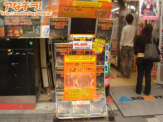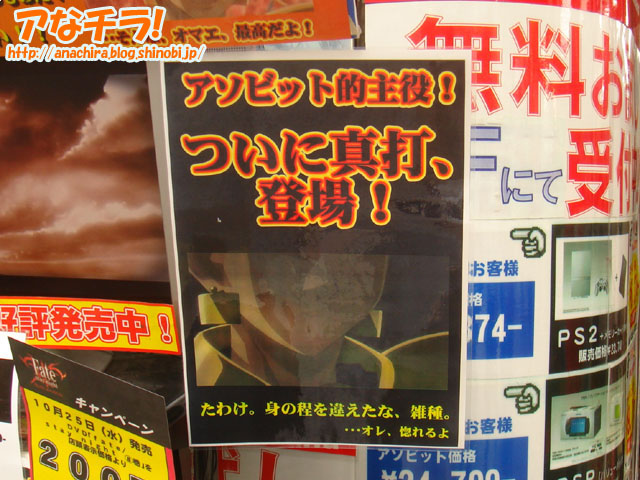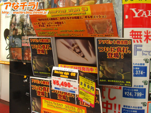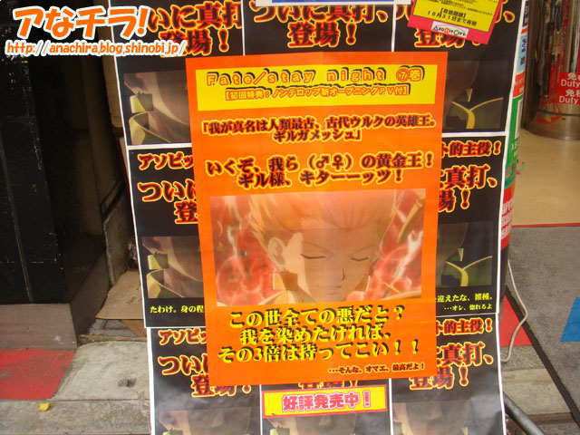 TVアニメ「Fate/Stay night」DVD7巻の見所をライバル「ギルガメッシュ」としている販促POP。展示しているのはアソビットキャラシティー。