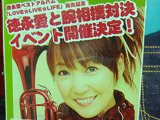 今回の腕相撲には勝敗によって徳永愛さんからプレゼントも用意されている。勝った場合は持参CDへの「直筆サイン」で、負けた場合は「お仕置き(内容はヒミツ)」とのこと。
